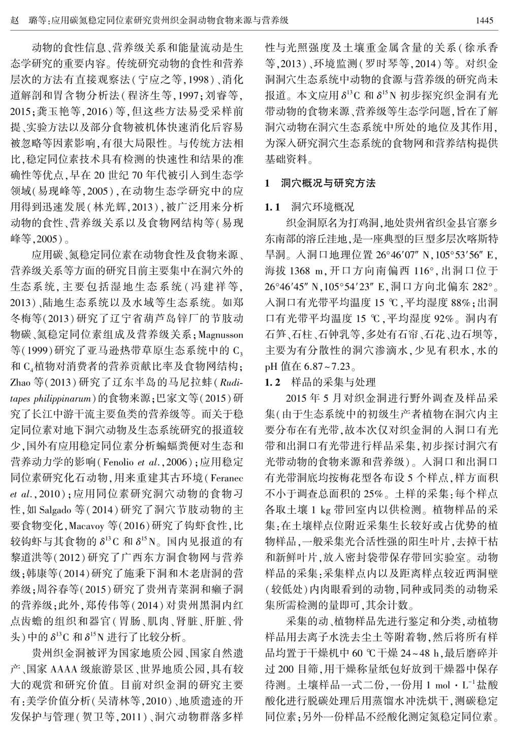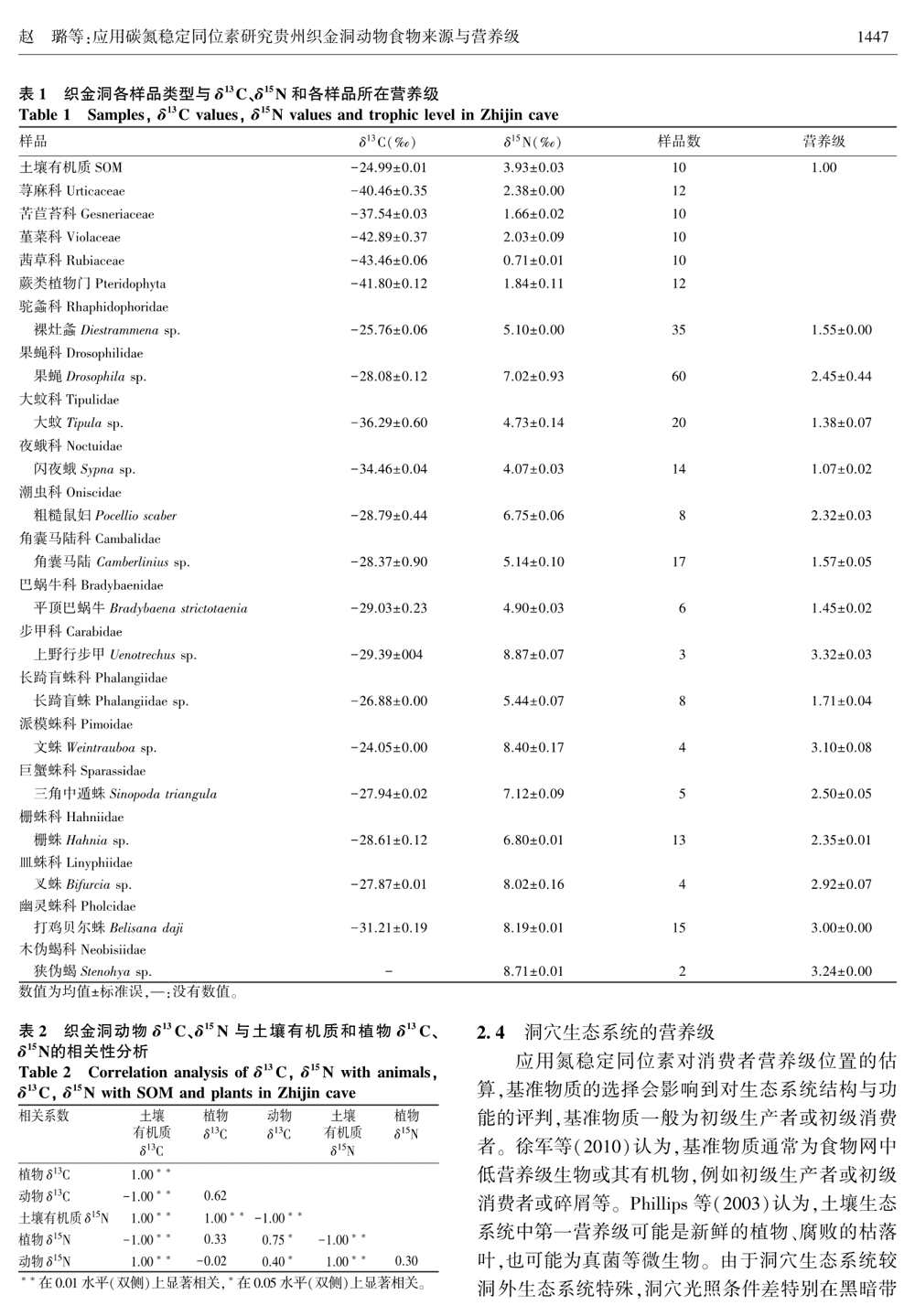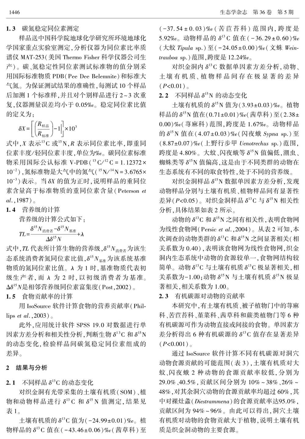 应用碳氮稳定同位素研究贵州织金洞动物食物来源与营养级