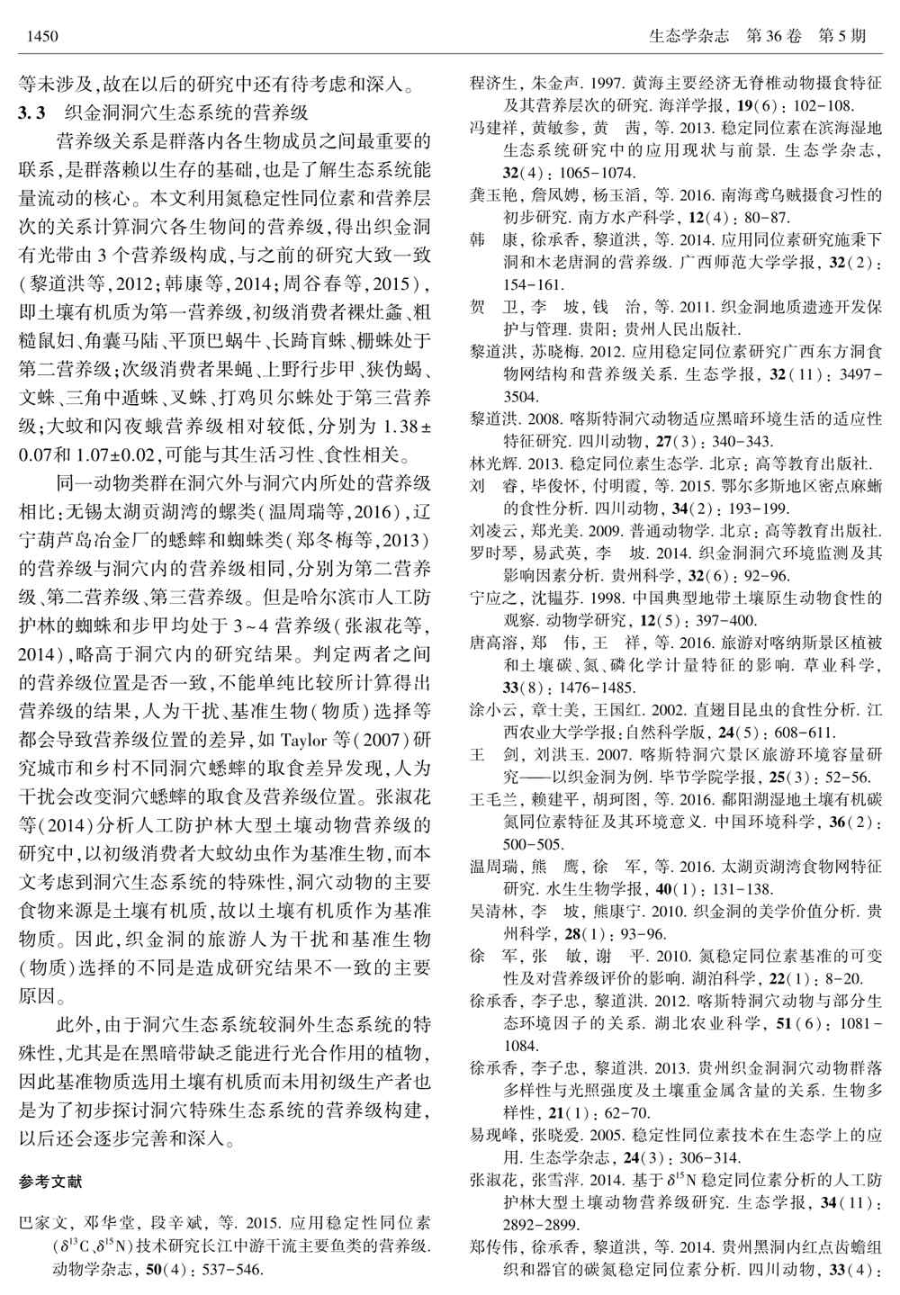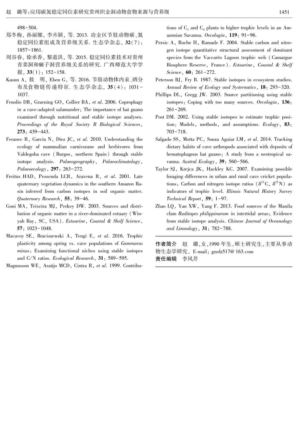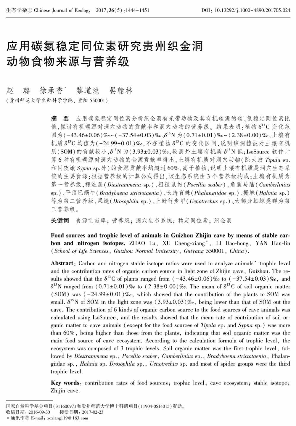 应用碳氮稳定同位素研究贵州织金洞动物食物来源与营养级