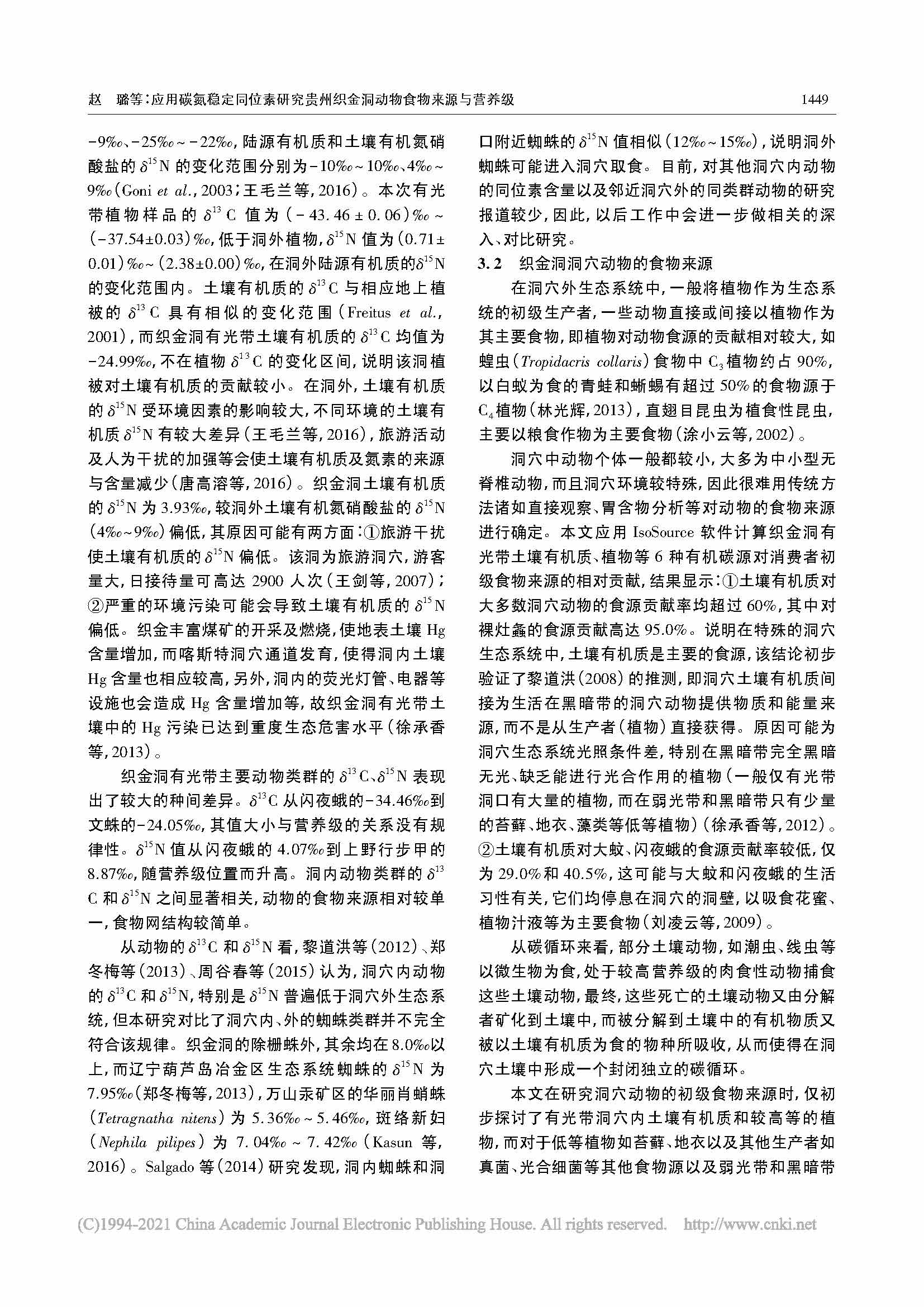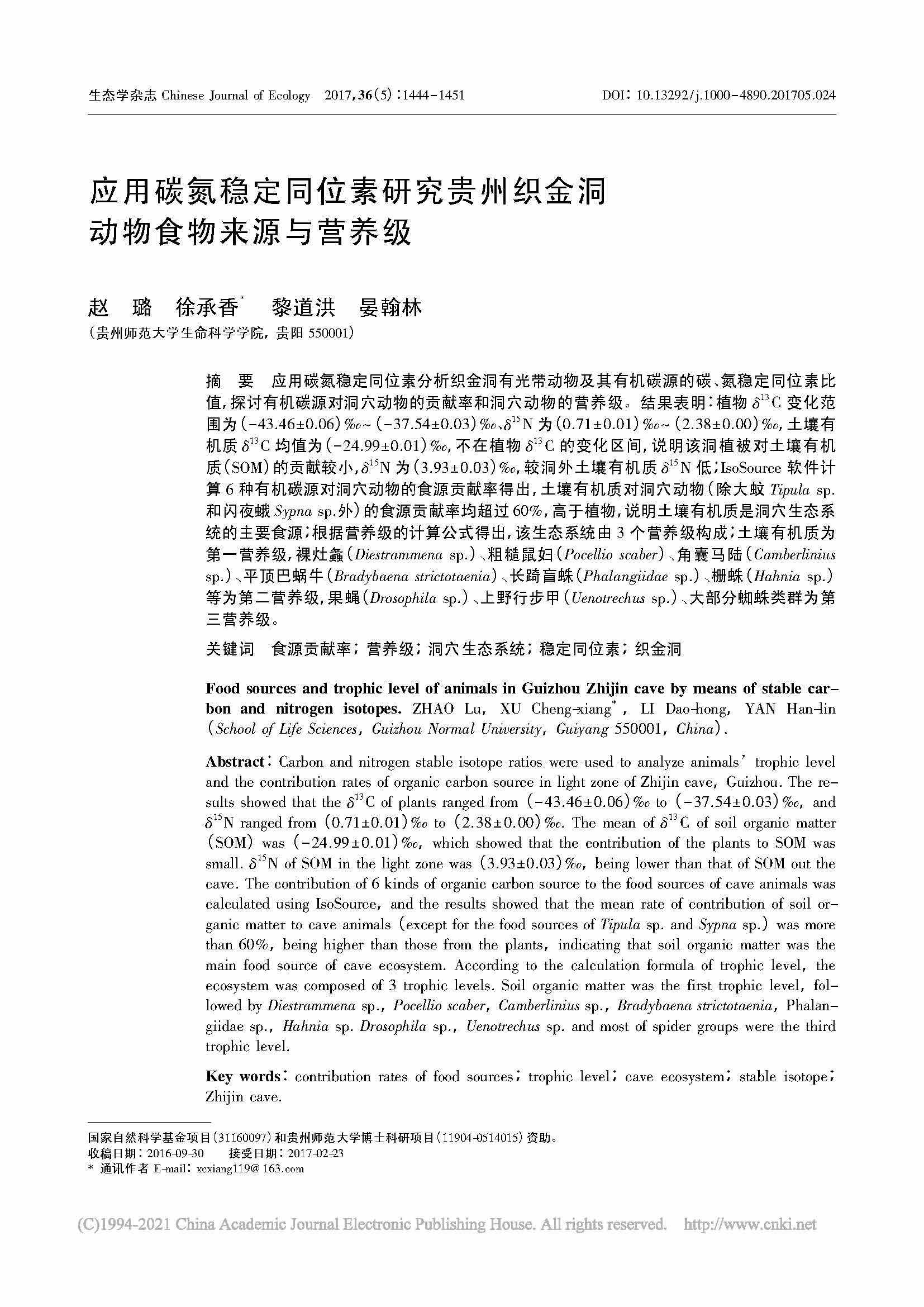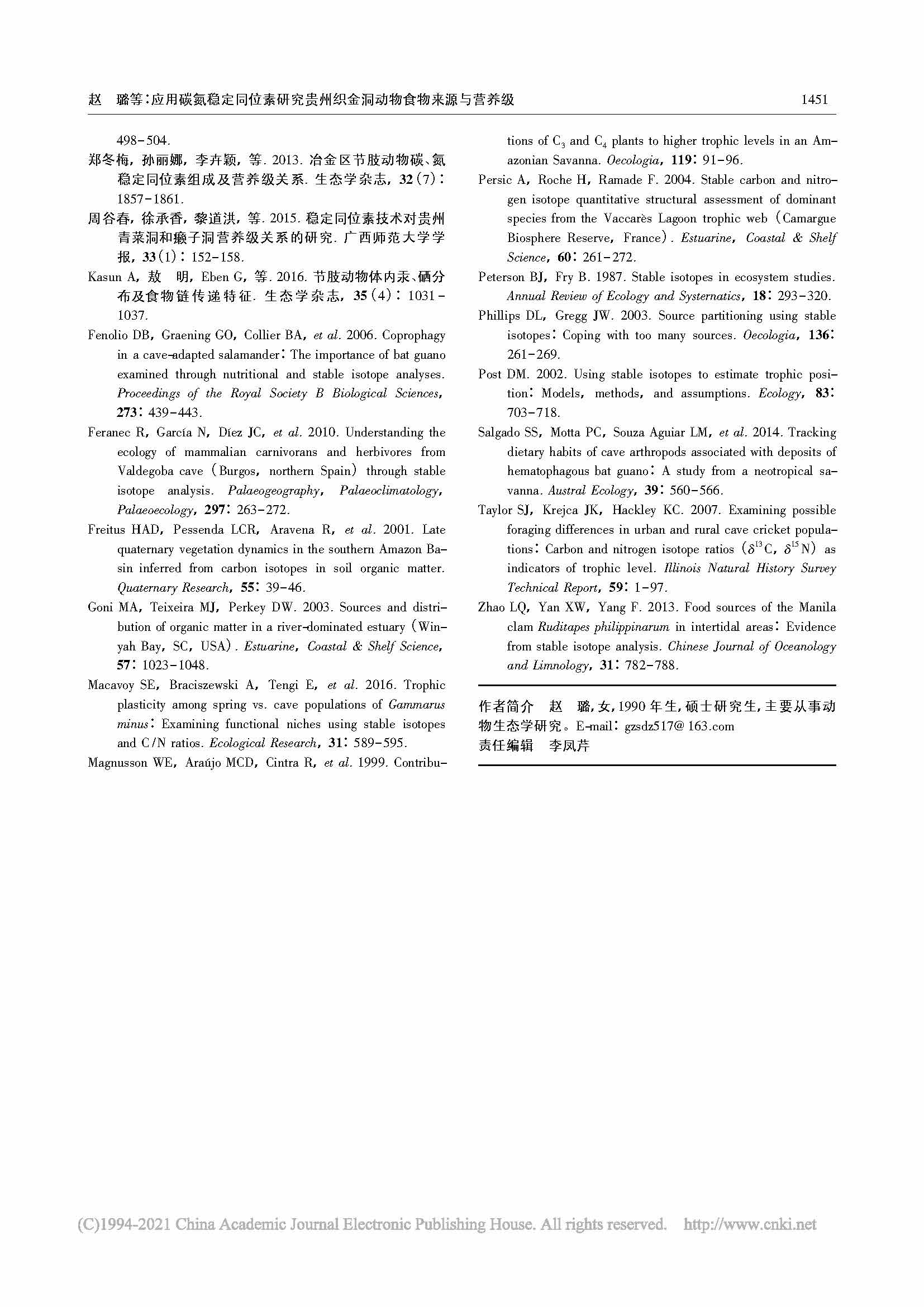应用碳氮稳定同位素研究贵州织金洞动物食物来源与营养级_赵璐